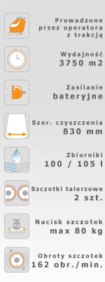 Nowoczesna zmywarka zasilana bateryjnie o wyjątkowych parametrach roboczych. Idealnie nadaje się do średnich i dużych obiektów, dzięki potężnym stulitrowym zbiornikom oraz szerokiemu, dwuszczotkowemu panelowi czyszczącemu.